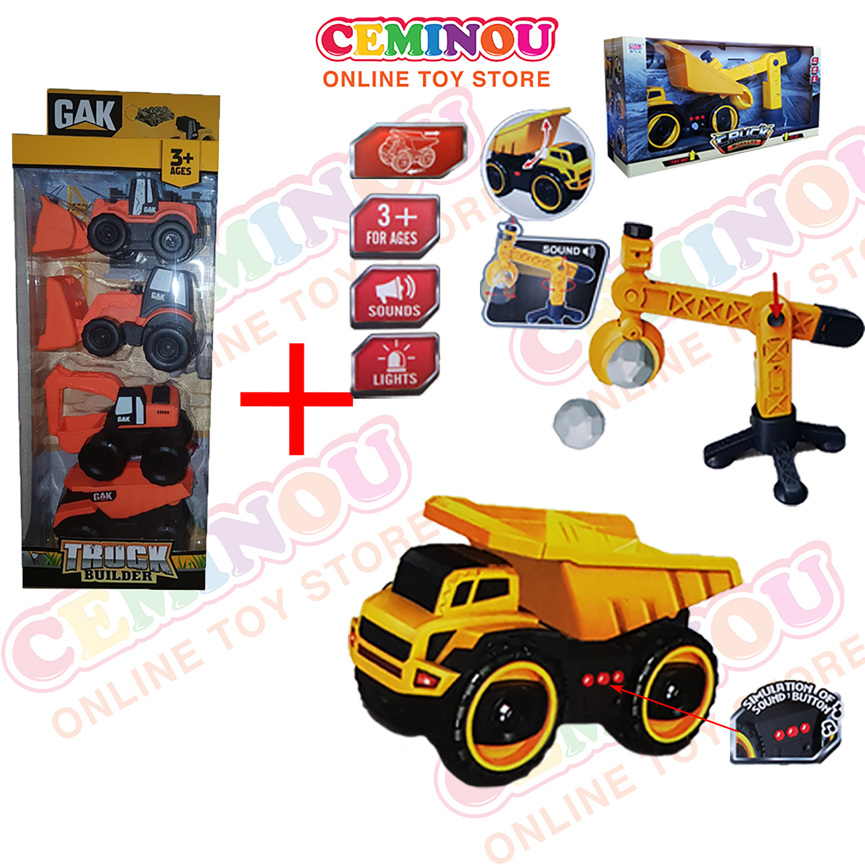 Tipper truck with rock crane, including simulation sounds for both items and flashing light for the truck .Your child will enjoy loading and unloading rocks to the truck via the swiveling crane.